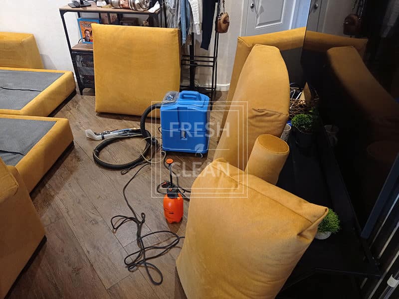 Сначала мастер почистил подушки, а пока они сохли, приступил к выведению пятен с посадочных мест. В последнюю очередь была почищена сама основа дивана. На весь комплекс работ, включая сушку, ушло всего 4,5 часа. При этом диваном можно было пользоваться сразу! Клиент остался доволен качеством, скоростью и результатом нашей работы.