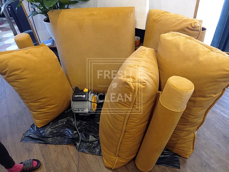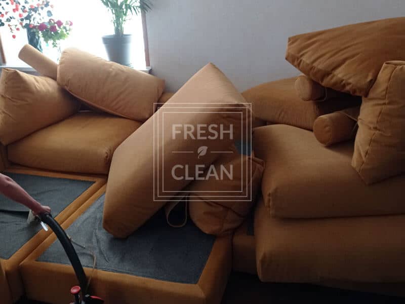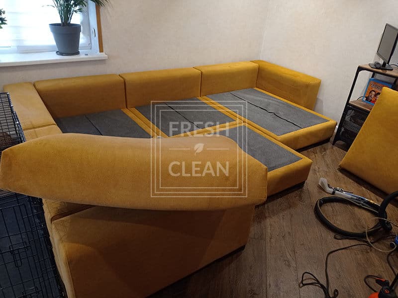 В ноябре 2022 года нам поступил заказ на чистку углового дивана с большим количеством подушек разных форм и размеров. Основной задачей было вывести запахи, удалить пятна и шерсть животных. Также клиент заказал сушку, поскольку живет в частном доме и испугался, что из-за повышенной влажности диван не высохнет и испортится.