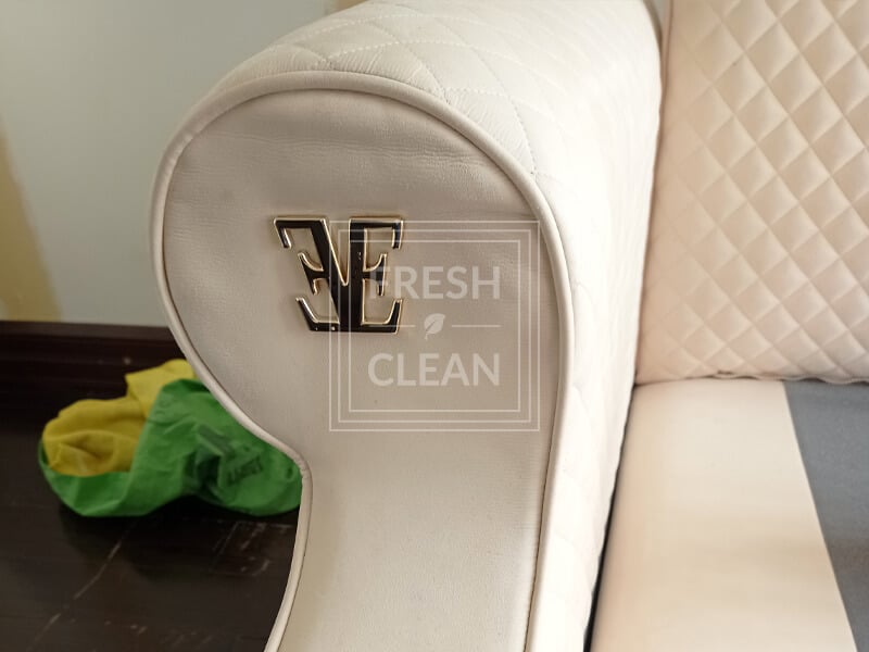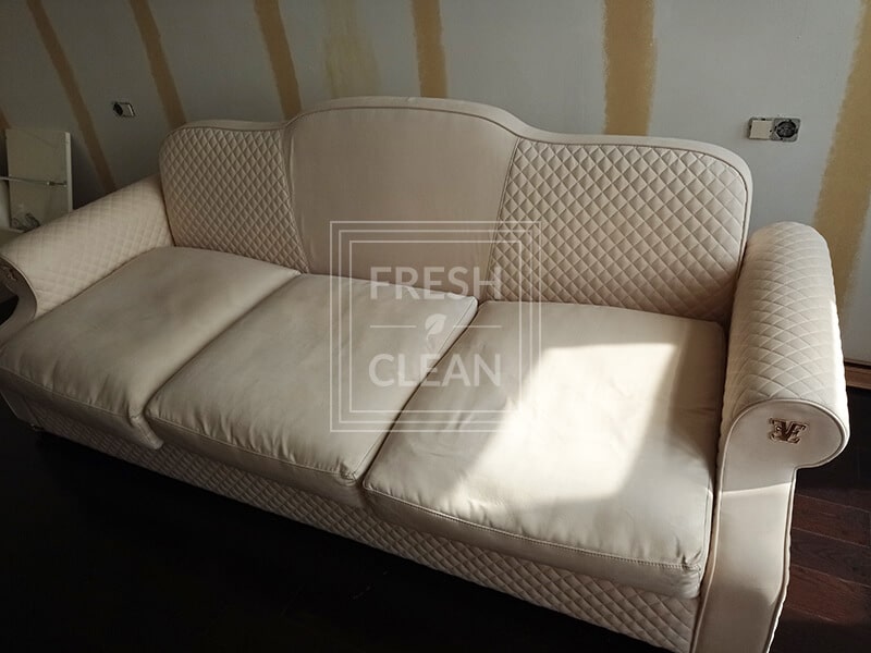 Особенность данной модели дивана заключается в наличии фактурных мелко стеганных элементов на спинке и подлокотниках. Подобная обивка усложняет работу мастеру, так как необходимо максимально качественно почистить все швы стежки. Это особенно важно на белом диване, иначе потемневшие швы станут неприглядным клетчатым рисунком на белоснежной обивке.