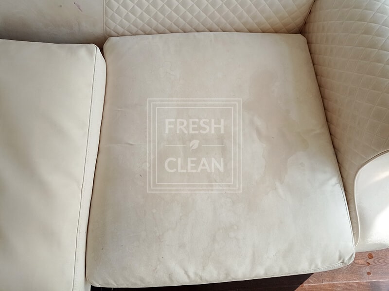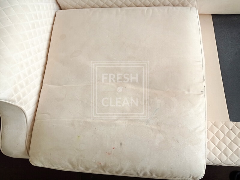 В июле 2022 года нам поступил заказ на чистку белого дивана дорого мебельного бренда. На снимках ниже можно увидеть, что на обивке есть пятна от ручки, фломастеров, небольшие следы от краски, продуктов и довольно обильные разводы от пролитых на диван жидкостей. Клиентка пояснила, что в семье есть несколько детей, поэтому диван активно используется и загрязнения на нем бывают разные.