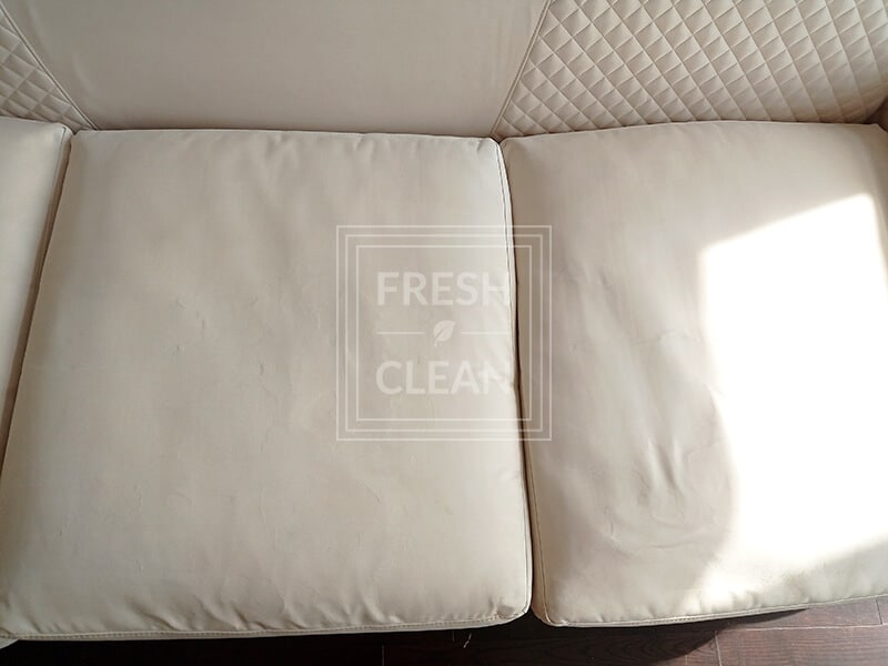Над этим заказом мастер Fresh Clean непрерывно работал 2,5 часа. За это время ему удалось максимально очистить пятна, в том числе старые и давно засохшие. Так как диван активно использовался как место для перекуса, мы сделали антибактериальную обработку и дополнительно провели процедуру удаления запахов. На фото ниже видно, что на сидении остались заломы от использования дивана, но для их устранения необходима замена обивки и части наполнителя.