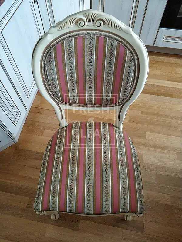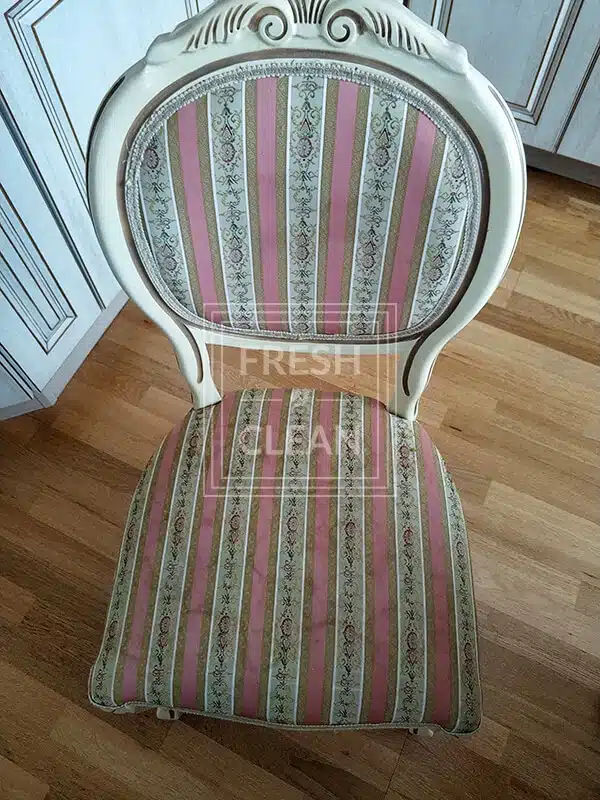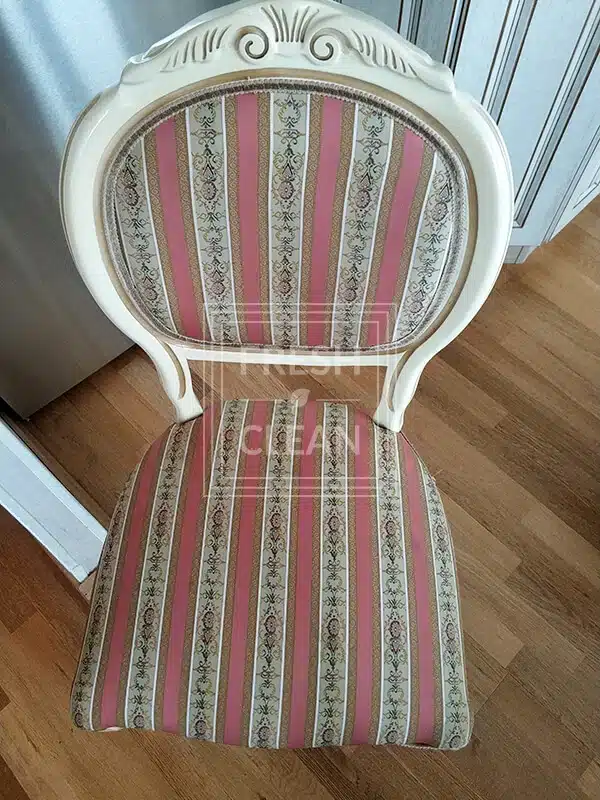 Стулья в стиле Прованс – наши постоянные клиенты по химчистке. В доме живет трое детей, поэтому обеденный гарнитур подвергается различным испытаниям. В этот раз из загрязнений на стульях было детское питание и напитки.