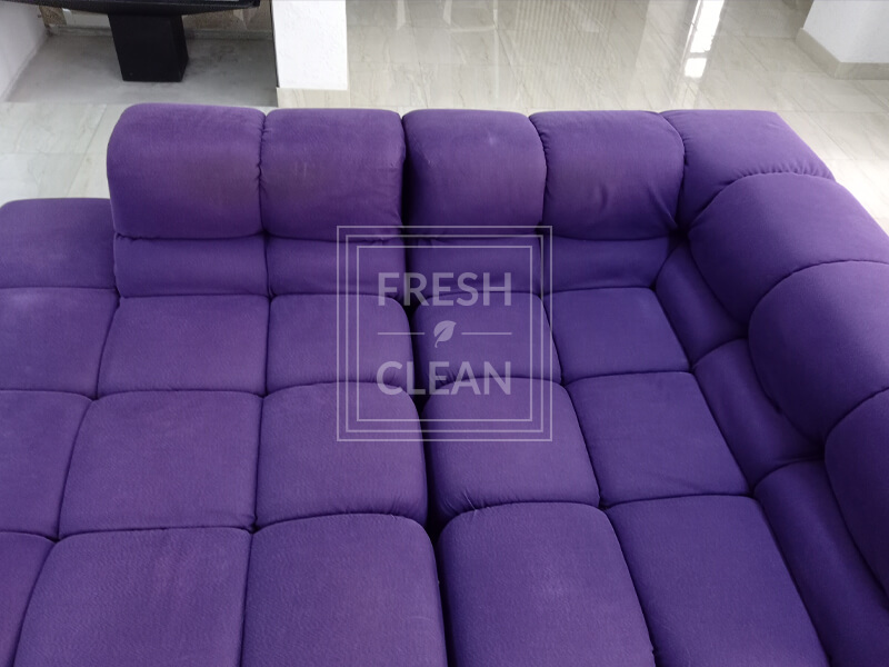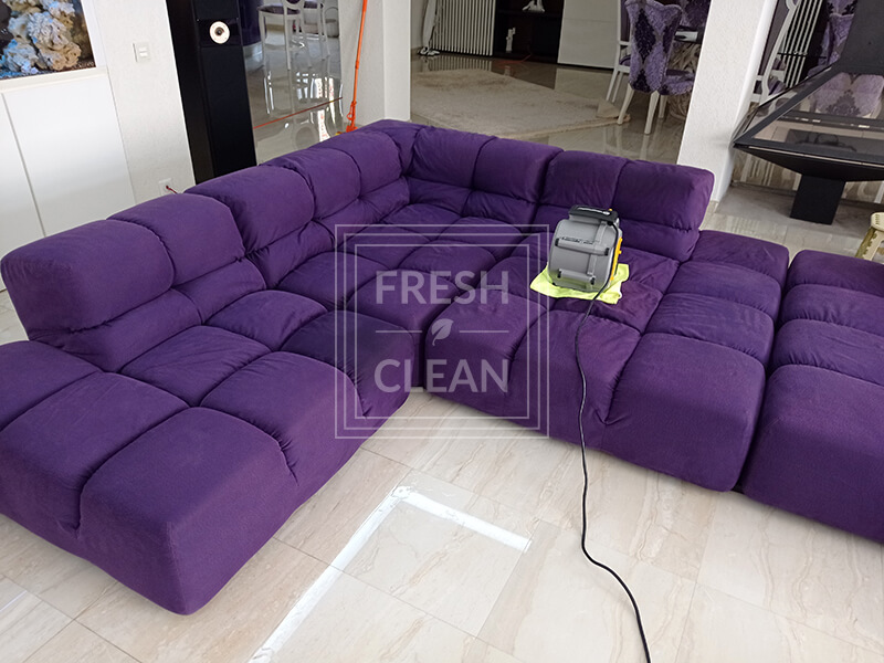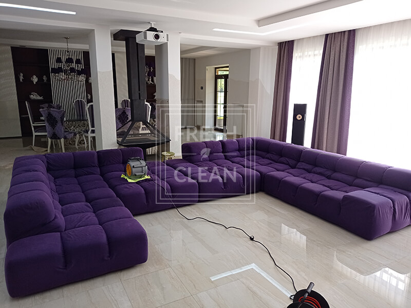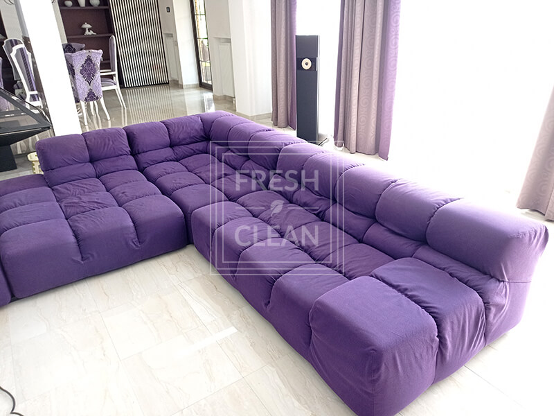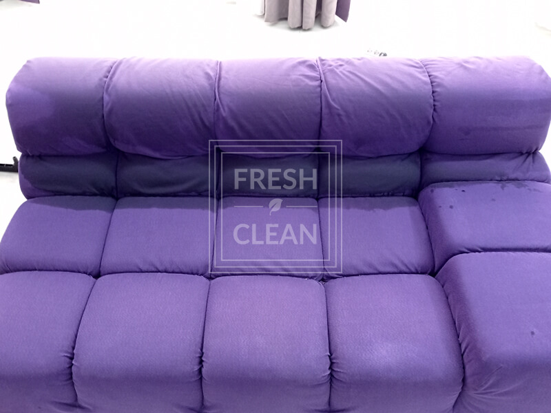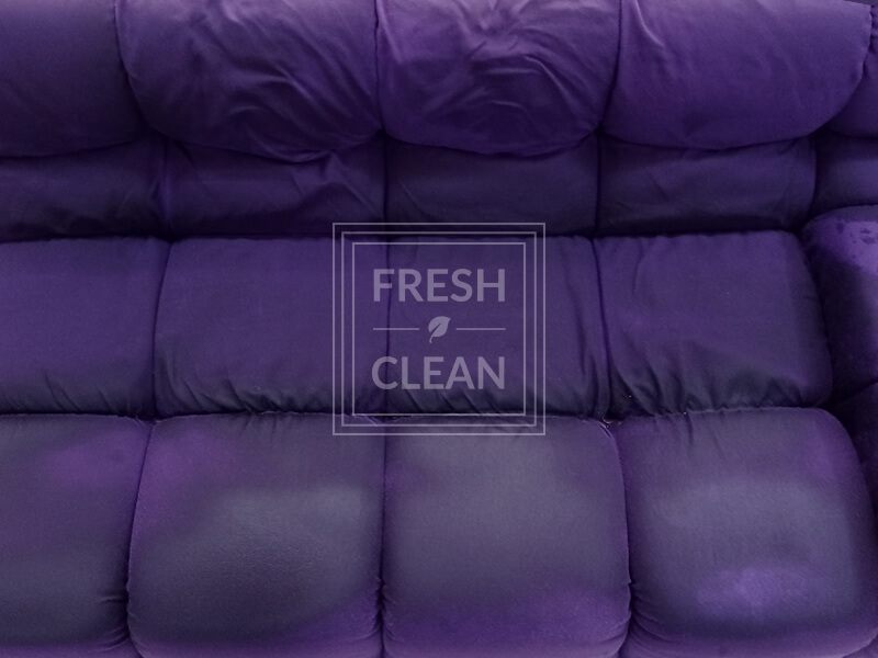 Этот огромный фиолетовый угловой диван заставил нашего мастера попотеть! Обивка была без особых загрязнений, но между квадратами забилась пыль и шерсть домашних животных. Вторая особенность заключалась в том, что на диван было нельзя наносить концентрированный чистящий состав из-за возможного срыва красителя обивки.