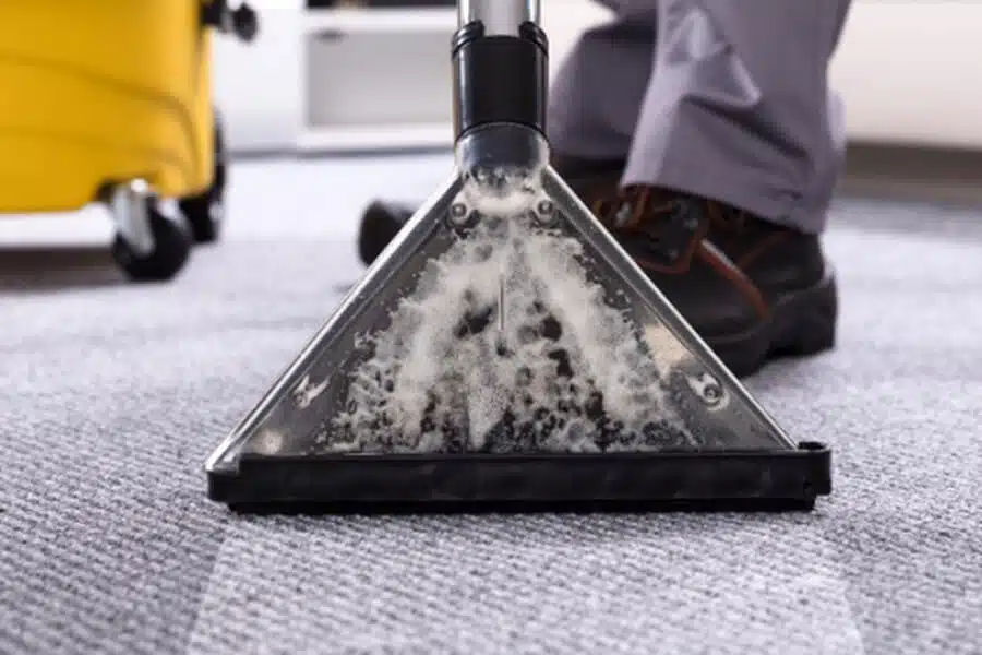 - Сухая. Подразумевает собой щадящую методику. При ней на ковролин распыляется пена, которая проникает глубоко в ворс. Такой способ особенно актуален для длинноворсовых ковров. После воздействия компонентов пены ее убирают при помощи мощного моющего пылесоса. По завершению процедуры ковролин остается практически сухим.