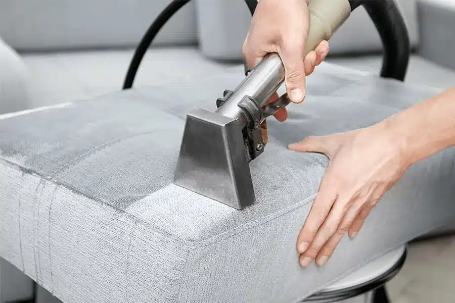- Перед применением химии специалисты очищают поверхность от пыли, удаляя ее глубоко изнутри. После этого мебель обрабатывают специальным моющим средством, которое проникает в ткань.